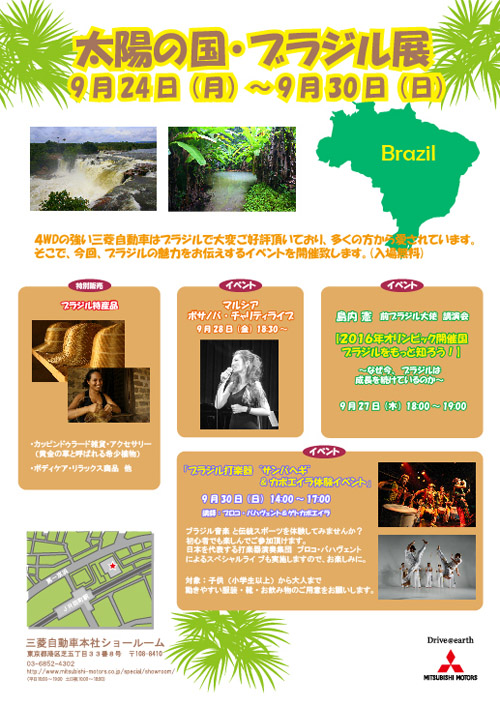 田町の三菱自動車本社ショールームで、9月24日(月)から、『太陽の国・ブラジル展』というブラジル物産展が開催されています。ブラジル映画祭も参加させていただおり、予告編の上映や、パンフレットの配布、チケットの販売をさせていただいております。
